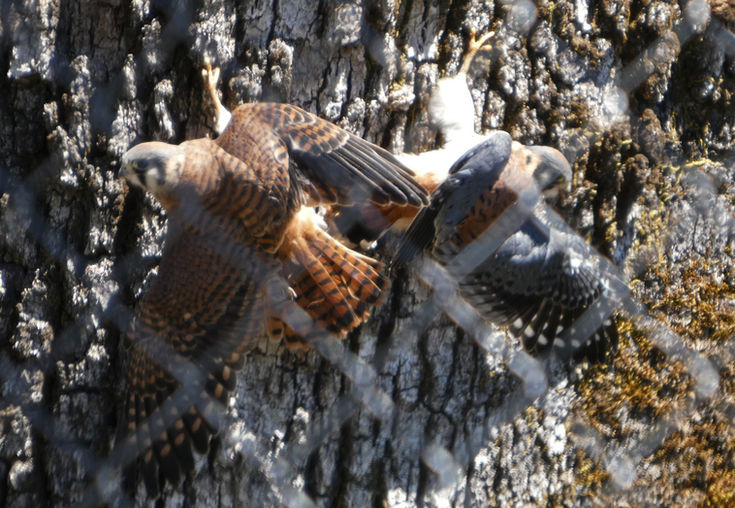 Mated pair of American kestrels raising young in the Davis Meeker oak