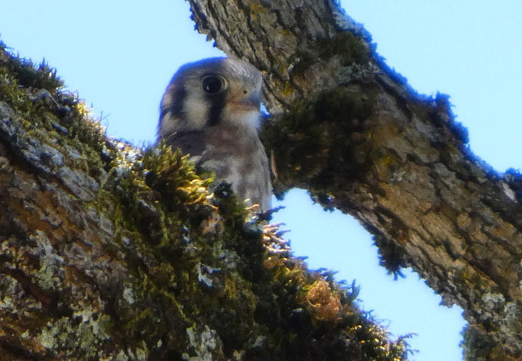 Mated pair of American kestrels raising young in the Davis Meeker oak